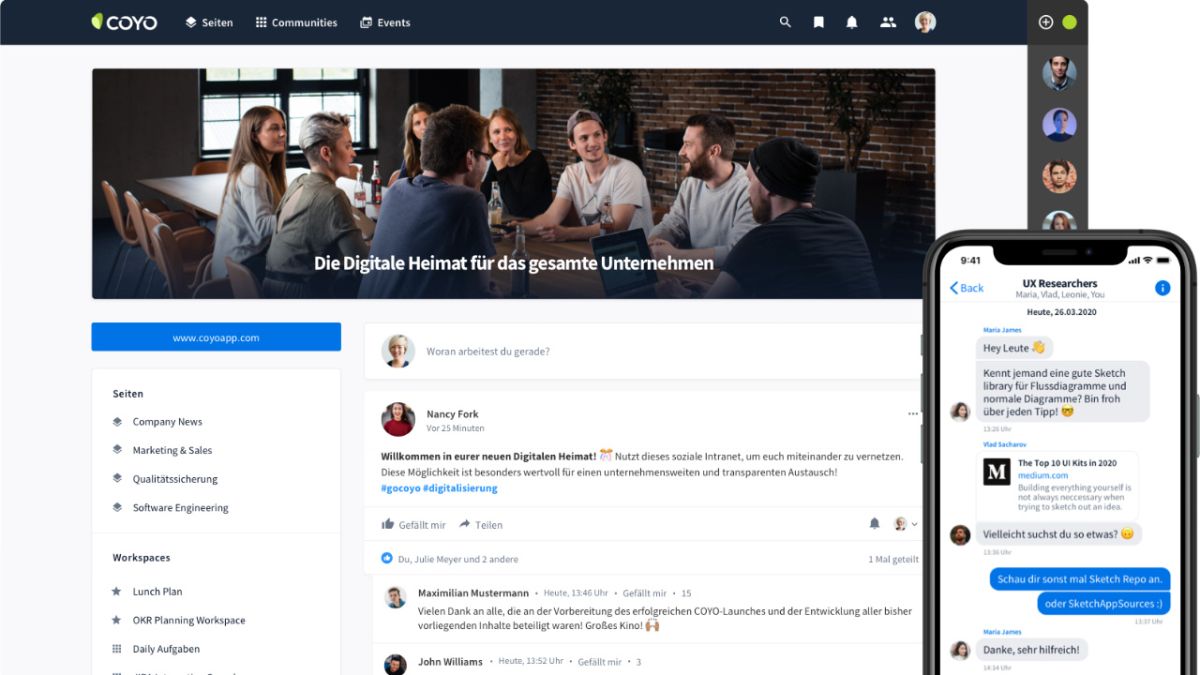 Sozial macht ein Social Intranet die Integration bekannter Funktionalitäten aus der Welt des Social Media. Mitarbeiter bekommen ein Gesicht durch Profile, können sich vernetzen, u.a. per Chat direkt miteinander kommunizieren, in Gruppen gemeinsam an Projekten arbeiten und vieles mehr. Die Kommunikation dezentral organisierter Mitarbeiter, z.B. im Homeoffce, wird deutlich einfacher und die Arbeit viel effizienter und effektiver. Eine klassische Win-Win-Situation für Unter